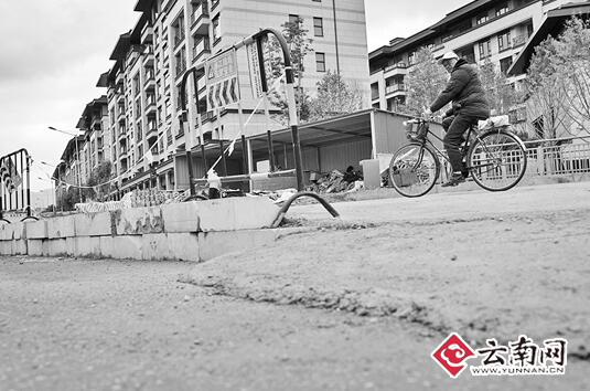 因小区门口围挡施工,近两年,昆明采莲郡小区的住户进出都要绕道而行。最近,围挡一拆,业主们都傻眼了:大门前一横一纵两条道路,都比小区路面高出了七八十厘米。业主们担心下雨时雨水会灌进小区,小区会成为新的淹水点。