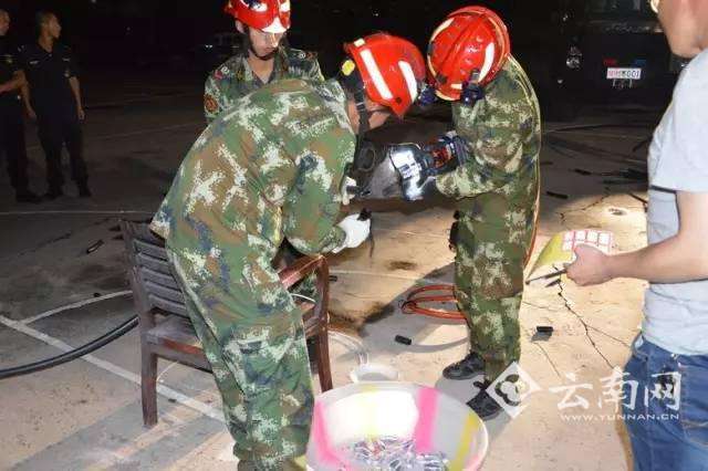 民警和消防战士正在切割塑料管寻找冰毒