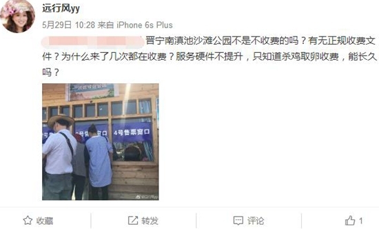 5月29日,网友“远风行yy”发帖称 “晋宁南滇池沙滩公园不是不收费的吗?为什么来了几次都在收费?”在其配发的照片中,可以看到,一座木结构的房屋设有4个贴有“售票窗口”的字样标识,现场疑有几名游客正在排队买票。