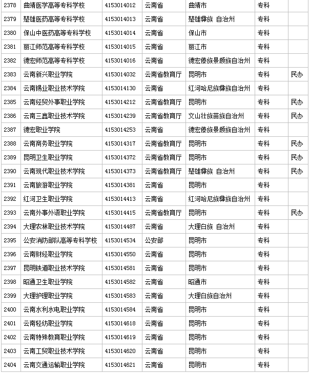 其中,我省共有普通高校77所。与去年相比,新增了滇西应用技术大学、云南轻纺职业学院、云南特殊教育职业学院、云南工贸职业技术学院、云南交通运输职业学院等5所。此外,我省成人高校仍为2所,分别为云南开放大学和南方电力职工大学。