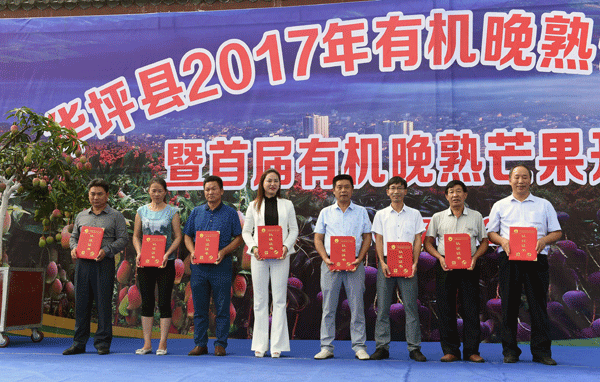仪式上,南京国环有机产品认证中心集中向华坪县农欣芒果种植专业合作社、华坪县金牛畜禽养殖专业合作社、华坪县绿益种养殖业专业合作社、丽江华坪金芒果生态开发有限公司、华坪县绿康源农业开发有限公司、丽江华坪县硕丰种植有限公司、华坪县中心镇灵宝果蔬种植专业合作社、华坪县星火农贸有限公司8家企业(专业合作社)颁发了《有机产品认证证书》。同时,南京国环有机产品认证中心还向华坪县华农科技开发有限责任公司、华坪县元山芒果种植专业合作社等12家企业(专业合作社)颁发了《有机转换产品认证证书》。