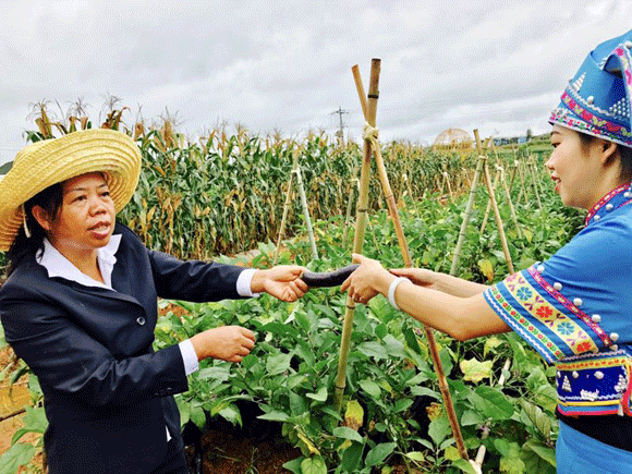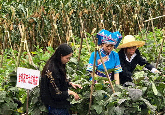 砚山县农业和科学技术局推广研究员高莹(左一)正在讲解黑俏茄的种植