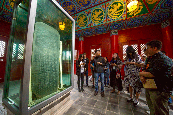 曲靖一中校长杨晶(左)正在讲解爨文化