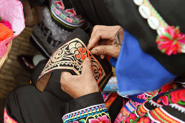 彝绣用色大胆夸张、构图精美、针法灵活、针脚细密、工艺独特、风格迥异,一针一线都是艺术品,一花一朵都是民族符号。一双裤脚,就是一幅经过变形处理的踏歌图;一个一尺见方的挎包,就是由变形人兽组成的星象图或八卦图;马缨花、山茶花、喜鹊和山茶等是彝绣里常见图案 ,马樱似火、山茶争艳、喜鹊闹梅、蝴蝶采花等等民族图案都展示着彝族的风姿。