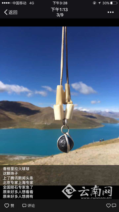 10日下午,一张网购平台上正出售“香格里拉陨石”的截图在网络流传。随后,云南网(微信公号:yunnancn)以“香格里拉陨石”为关键词在淘宝上搜索,发现确有一店铺在出售一款名为“香格里拉陨石,2017年10月6号发现”的商品信息,其标价从8000元到20000元不等,地址为云南迪庆,月销售0。商品图片为一块约手掌大小的黑色石块,石块表面有很多大小不一的细孔,商品介绍称这石块是香格里拉火星陨石,还标出“喜欢的就随缘,量少不等人”的信息。