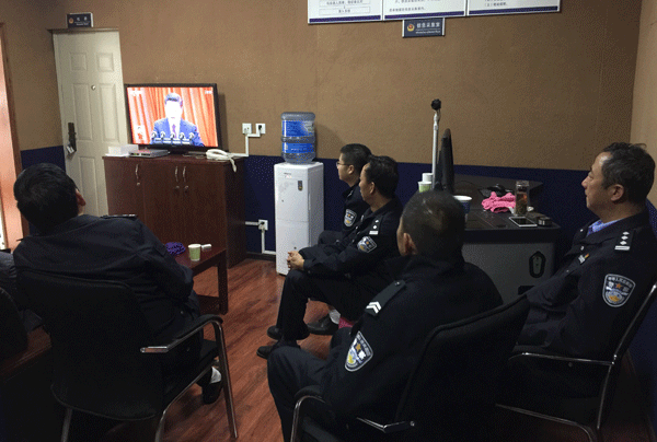 呈贡区森林公安局干警们欢欣鼓舞喜迎党的十九大,局长李城组织大家在局办案区收看十九大开幕会。