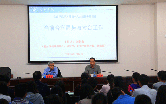 报告会特邀国台办研究局局长、研究员、九州出版社社长、总编辑张黎宏以《当前台海局势与对台工作——学习贯彻十九大精神》为题进行专题辅导。张黎宏紧紧围绕党的十九大报告中对台工作的重要论述,从对台工作在党和国家工作中具有全局性、战略性的重要地位;十八大以来的对台工作与当前台湾局势及发展趋势;深入学习理解贯彻习近平同志关于对台工作的重要思想四个方面进行阐释。张局长强调,十八大以来,面对复杂严峻的台海局势,习总书记准确把握国内外大势,运筹帷幄,积极作为,始终把握战略主动,引领两岸关系不断取得新突破、新进展。张局长还通过自己多年来从事对台研究和赴台考察的经历,提出很多独到的见解,使在座师生对当前的台海局势有了更清晰的认识,对下一步学习理解十九大精神有了更好的把握。同时,此次专家辅导还是对我校宣讲团开展宣讲活动前的一次专题辅导,为今后宣讲团深入开展宣讲活动提供了崭新思路,为师生进一步牢固树立“四个意识”,增强“四个自信”,更加坚定实现两个一百年奋斗目标、实现中华民族伟大复兴的中国梦奠定了思想基础。