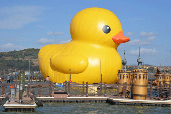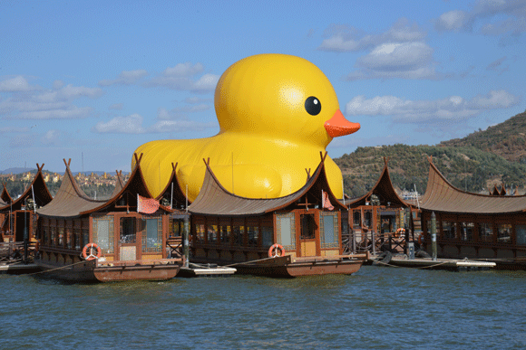 2017122918米的大黄鸭在昆明市晋宁区古滇大码头下水了,2018年元旦期间,喜迎游客四万多人来游观。