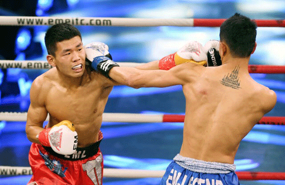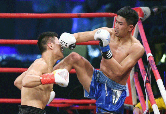 在自由搏击65KG总决赛中,泰国选手莽星(右)战胜中国选手张成龙,获得金腰带。(新华社记者 杨宗友摄)