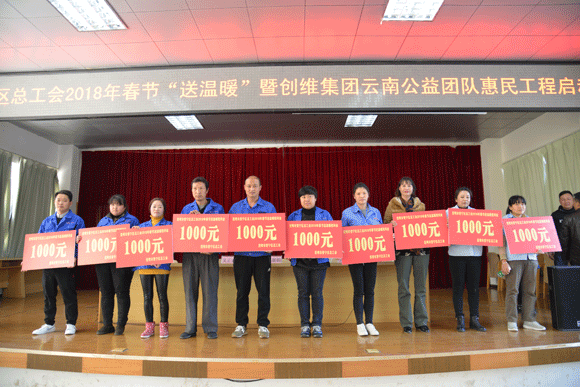 2018年春节期间,区总工会将筹集资金19万元,慰问困难职工190人,切实保障困难职工度过一个温暖祥和的春节。倾力帮助困难群体,不仅仅是工会的职责,也成为社会各界的共识。今天,创维集团云南分公司现场为困难职工捐赠200台电饭煲和一万张惠民折,每张优惠500元。让更多的困难职工享受到更好的福利,用春天般的温暖,驱走冬天的寒冷,形成人人帮我,我帮人人的良好社会氛围。