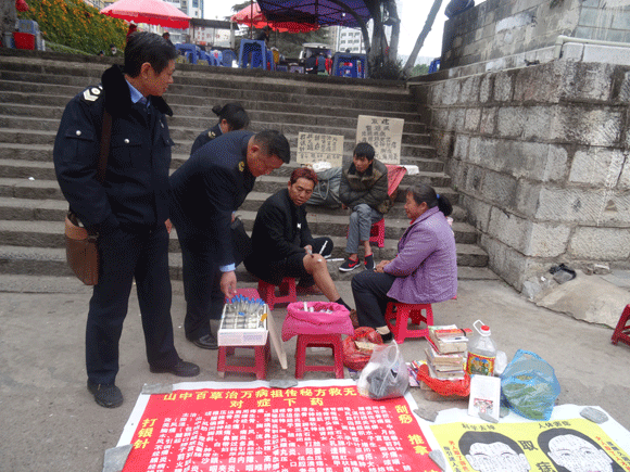 2017年,文山市卫生计生监督执法局开展打击非法行医行动,共出动卫生监督员(协管员)150人次,巡查城区河滨路、下沙坝等街道15条,乡镇集市14个,行政村集市3个。摘除“民族民间医药研究组”匾牌3个,登记保存打磨机、探针、拔牙钳、镊子等诊疗器械500余件,药品600余支。对乡镇开展打击非法行医巡查28次,城区开展打击非法行医巡查30次,当场行政处罚17起,立案处罚7起,罚款36850元,没收违法所得21500元,下发《卫生监督意见书》36份。