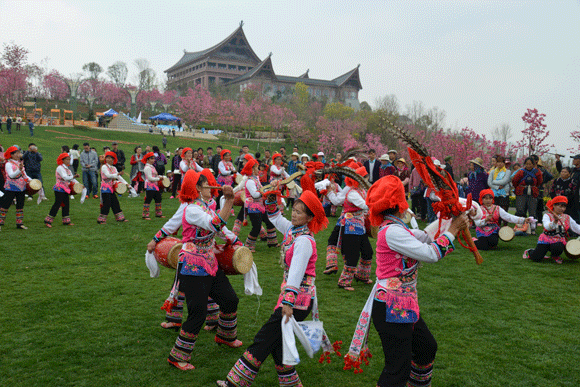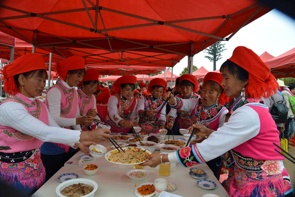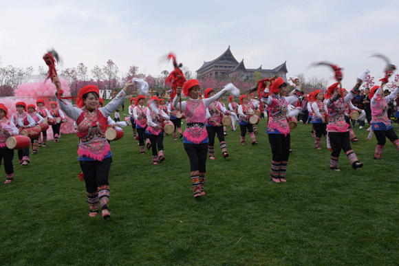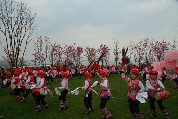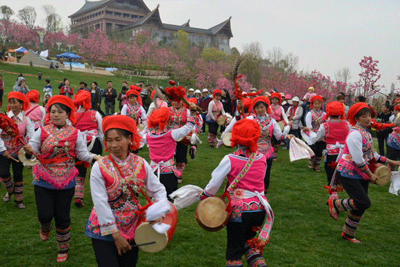 “咚咚咚……”一组身着彝族服装的队伍吸引了游客的眼球,这是清一色的女子秧佬鼓队,她们个个头戴红头巾、带上腰鼓,一手持白手巾,一手持彩色羽毛,边挥舞,边击鼓,随着时而激烈、时而缓慢的鼓点节奏,她们也随之或飞舞旋转、或轻轻踏步。这富有民族风情的表演吸引了游客,纷纷拿出手机拍照留念。据悉,这是来自晋宁双河彝族乡的农民秧佬鼓表演队, 2005年晋宁“双河彝族秧佬鼓舞之乡”被列为云南省首批非物质文化遗产保护名录,成为了晋宁民族传统文化的重要代表。近年来,晋宁县的秧佬鼓队伍得到了空前发展,全县城乡秧佬鼓队伍达300多支,秧佬鼓舞已成为广大群众喜闻乐见的一种民间传统舞蹈。