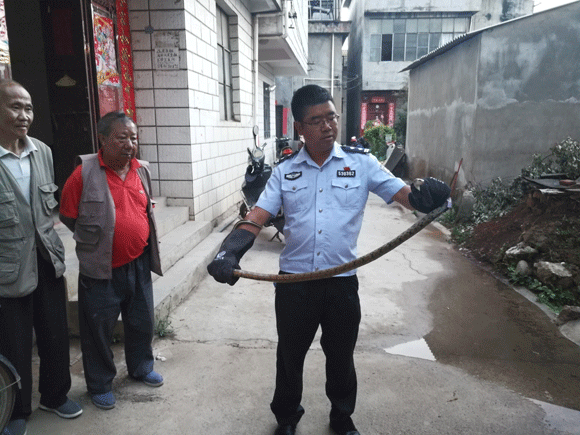 5231935分,晋宁区森林公安局接晋宁公安分局110指挥中心指令称,在昆阳街道办事处阳光寺一村民家中有一条蛇,要求森林公安出警处置。
