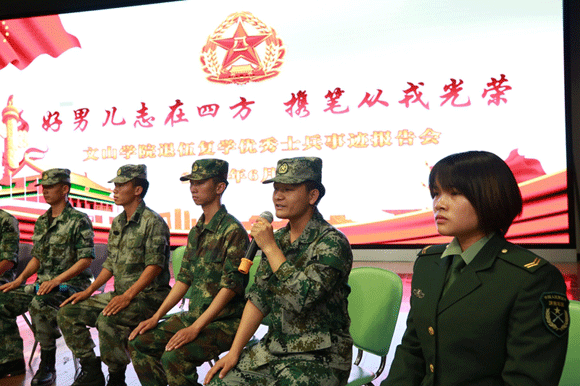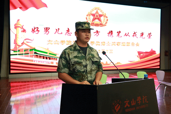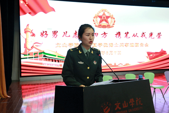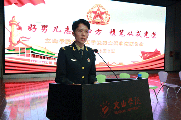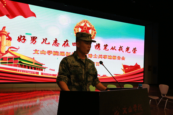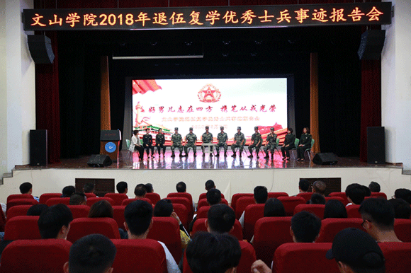 为进一步激发广大适龄青年大学生参军报国的热情,积极响应祖国号召,携笔从戎报效国家,6月7日下午,文山学院在艺馨楼报告厅举办了主题为“好男儿志在四方 携笔从戎光荣”的退伍复学优秀士兵事迹报告会。文山军分区副司令员尹晓武、动员处处长李保红,文山市武装部政委李树卫,三鑫职业技术学院副校长李庆红,文山学院党委书记熊荣元、党委副书记张晓憬、副校长吕昌会出席报告会。文山学院退伍复学士兵赵艳琴、刘祖涛、王履茂、世家显、段雪娟、朱树斌、冯明威、王金秀、杨琳鹏、张洁、李凯林,师生代表共计500余人参会。报告会由雷丽教授主持。