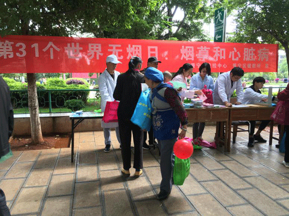 为加大控烟宣传和健康教育工作力度,推进我国控烟履约进程,65日由晋宁区爱卫办、区卫计局牵头,组织多个局属医疗单位在昆阳郑和文化广场开展了“第31个世界无烟日”宣传活动,向过往的群众免费义诊咨询,发放宣传小折页、宣传单、健康教育处方、宣传环保袋等资料共计1000余份,同时在各单位电子屏幕上滚动播放相关的控烟宣传标语,通过这次宣传活动使晋宁广大人民群众的控烟意识得到提高,自觉主动进行参与控烟行动。