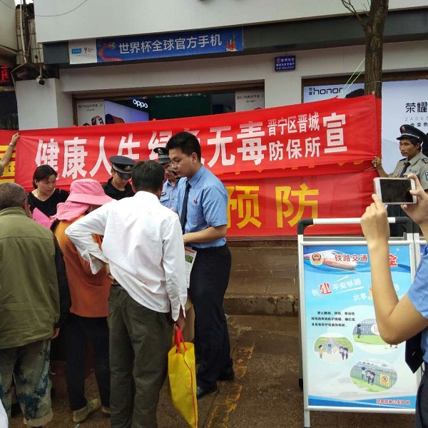 (记者 钱丙申 通讯员 蔡耀光)2018年,是昆明市第四轮禁毒人民战争深化、攻坚之年。按照省、市、区禁毒工作会议精神要求,晋城镇综治办联合晋城防保所、晋城派出所、司法所、社保所等相关单位于2018年6月26日在晋城水果街举行了 “健康人生  绿色无毒”为主题的“6.26”国际禁毒日宣传活动。