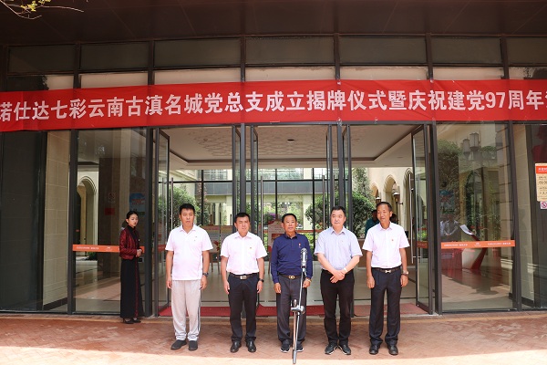 (记者 钱丙申 通讯员 宋俊)7月2日,诺仕达七彩云南古滇名城举行了党总支成立揭牌仪式,献礼建党97周年华诞。古滇管委会常务副主任徐波、区委常委、组织部部长李雁昆、诺仕达集团创始人、党委书记任怀灿出席揭牌仪式并讲话。区“两新”组织党工委、古滇管委会领导、七彩云南古滇名城党总支党员代表、养老养生小镇常住客户党员代表60余人参加揭牌仪式。