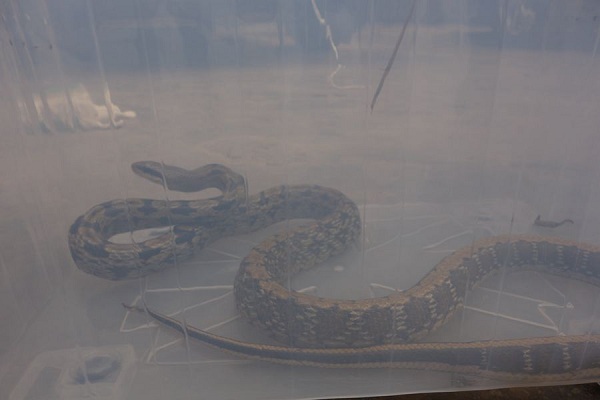 接警后,呈贡区森林公安局立即组织民警携带捕蛇工具赶至现场,民警带上防护手套,找来蛇夹,企图用蛇夹夹住菜花蛇,但菜花蛇没有善罢甘休,极力挣扎,不停地吐着长长的信子,经过2分钟的努力,将蛇捕获,通过民警观察,基本判断该蛇为菜花蛇,蛇体较大,长度达1.3米以上。民警对其进行了全面的体表检查,未发现有任何伤残情况,健康状况良好。随后,值班民警将蛇送到昆明市濒危动植物拯救中心,经工作人员鉴定,是一条黑眉锦蛇(俗名:菜花蛇),是国家“三有保护动物”