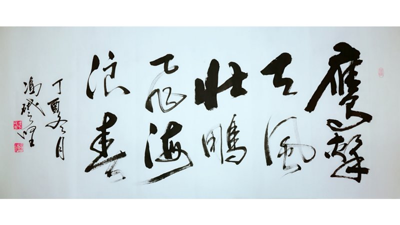 他还认为书法要表现一个书家的情趣、思想、个性,以及反映出自己的文化内涵、艺术修养。书法要与时俱进,绝不能一味的追求古意,要体现新时代的风貌和自己的特质。所以在书写中,他不刻意法度的追求,不在乎点画的优美均衡,强调笔势字型的起伏粗细变化及顿挫抑扬之意,以自己深厚的武术功力与才气入书。掌握住力量与平衡、速度与节奏,起笔前运气于身,落笔时力透纸背、截铁断金。