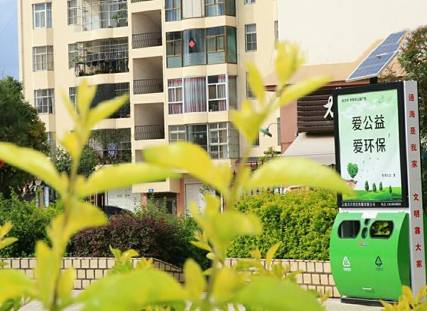 在东苑社区,融合了“低碳环保、绿色生活”概念的太阳能保洁箱均被放置在道路交叉口或人流量相对较大的显眼位置,灯箱上还配套了“社会主义核心价值观”“文明城市创建”“平安社区”等精神文明建设相关内容,不约而同地和社区建设的“文化墙”形成立体多层次的文明新风的宣传“阵地”,在润物细无声中传递精神文明新风尚。