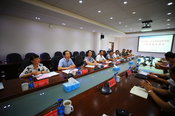 为响应《关于深化人才发展体制机制改革的实施意见》文发2017【27】号文件精神和2月26日全州组织工作座谈会暨组织部长会议上,童志云书记关于“人才短缺仍然是制约文山发展进步的一大短板,要结合文山州情实际和发展需要,要重点打造好高素质的公共管理和社会服务人才队伍、有竞争力的经济工作人才队伍、高水平的专业技术人才队伍和大规模的乡土人才队伍。”的部署,搭建校地科技平台及共享人才资源,7月6日,文山学院与文山州农业科学院开展合作交流座谈会。州委组织部人才科科长刘芳,文山州农业科学院院长李存龙、文山州农业科学院副院长李云、朱汉勇、罗龙及科技管理科、稻作研究所、辣椒研究所、旱粮研究所、生物技术研究所、畜牧和水产研究所和经作研究所相关负责人,文山学院党委书记熊荣元、校长郝南明、党委副书记冯林虎及人事处、教务处、科技处、环资学院、三七学院、文山三七研究院、化工学院等相关部门负责人参加了座谈会。