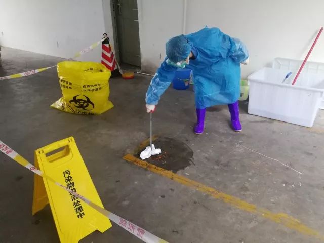 (清洁员对泄露的医疗废物迅速进行收集清理,对污染地点进行清洁消毒。)