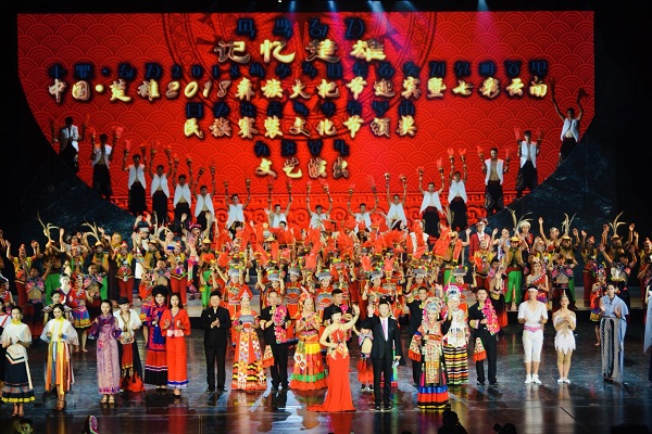 8月5日晚,楚雄市太阳历文化园人山人海、热闹非凡,灯光、火光、高空礼花照亮夜空,歌声、乐声、欢呼声响彻云霄。以“火”为主线,展示彝族传统习俗和火文化魅力的中国·楚雄2018彝族火把节祭火大典在这里隆重举行。来自国内外的嘉宾和游客欢聚一堂,感受彝家人火一样的热情。火代表热情,象征吉祥,寄寓希望。彝族是崇拜火的民族,千百年来,彝族先民用火取暖、照明、祭祀、庆祝和烹调食物,虔诚守护着火种,对火充满敬畏与感激。在欢快激扬的彝族歌舞表演中,祭火大典拉开了的序幕,德高望重的毕摩念诵起祭祀火神的毕摩经,祈求来年风调雨顺、五谷丰登,为大家送上节日火红的祝福。诵经祈福之后,毕摩钻木取火,随着缕缕青烟升起,2018年彝族火把节的火种点燃,现场响起阵阵欢呼声。随后,伴随着彝族的大号、唢呐、羊皮鼓舞,出席庆典仪式的领导嘉宾在主祭毕摩的带领下,点燃了象征吉祥、丰收、幸福的主火把,并加入到火把巡游队伍中,一同融入了火的狂欢。熊熊火光映照下,天空礼花齐放,璀璨夺目,火把狂欢也随之开始,人们“耍”着火把,唱着彝族跌脚调,跳着左脚舞,沉醉在火的乐章中,共同感受彝族火文化的博大精深。