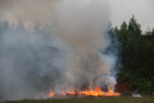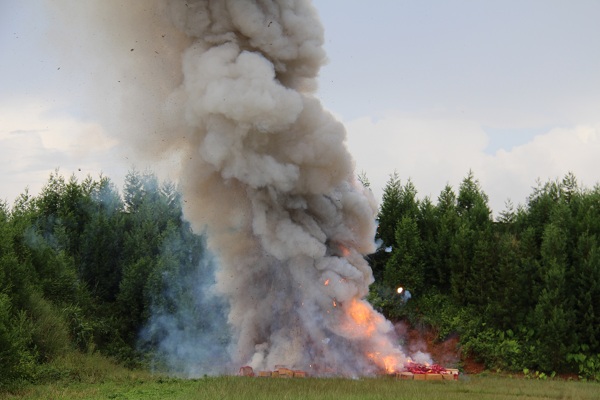 销毁现场,随着指挥员一声令下,工作人员开始点火销毁假冒伪劣烟花爆竹产品,瞬间“噼里啪啦”的响声连接熊熊烟雾腾空而起。