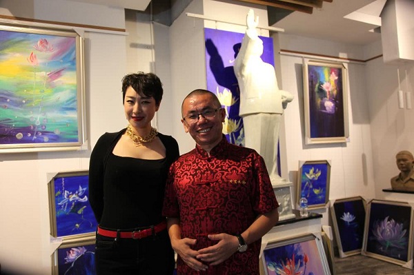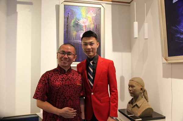 云南著名画家丁昌胜(左)与央视主持人王斌在中国梦爱心助你上大学大型募捐公益活动现场