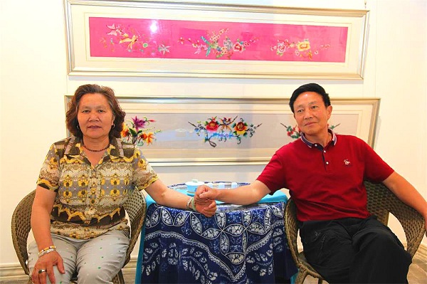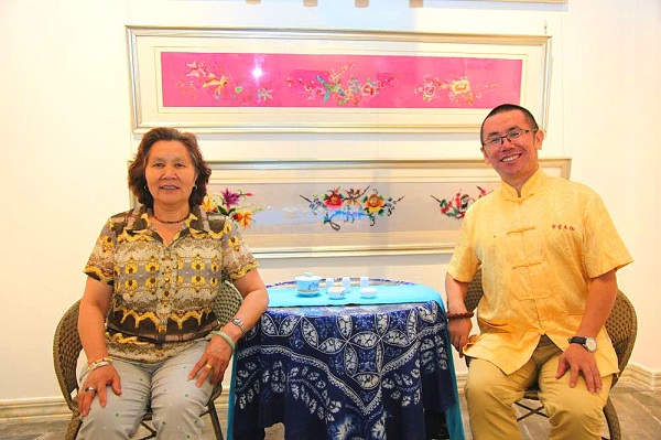 著名画家丁昌胜的母亲(左)与贵宾交流
