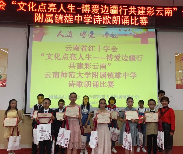 经过申报而获得省红十字会项目支持的镇雄县红十字会根据规定内容,与云南师范大学附属镇雄中学积极策划了以学生诗歌朗诵为引领,以百人应急救护知识培训、“探索人道法”现场教学、红十字青少年志愿服务等为主要内容开展活动组织项目实施。 从8月开始,他们精心组织应急救护知识培训进校园。镇雄县红十字会对云南师范大学附属镇雄中学高一、初一36位班主任和1771名学生开展应急救护知识讲座和培训;首开“探索人道法”示范教学。2018年获得红十字国际委员会、中国红十字会颁发证书的云南首批人道师资,玉溪华宁一中的刘萍老师应邀为云师大附属镇雄中学初二(14)班49名学生及相关老师上了一堂别开生面的“探索人道法”课程,拓宽了学生们的知识面,增加了对红十字运动基本知识的了解。云南省红十字会造血干细胞库开展了造血干细胞捐献科学知识普及和宣传。更为精彩的是由县红十字会、云师大附属镇雄中学共同举办的“我心中的红十字”诗歌朗诵决赛。16名选手分别来自初二年级16个班级比赛的第一名。诗歌大多是孩子们自己创作,内容包括红十字会“三救”“三献”工作内容,感情真挚,文笔流畅、形象生动。在28位老师的指导下,一个个小选手精神饱满、感情充沛的朗诵深深感染着每一个人。整个朗诵比赛组织的有声有色、形式多样、丰富多彩,足见师生们的喜爱、热情、能力与水平。