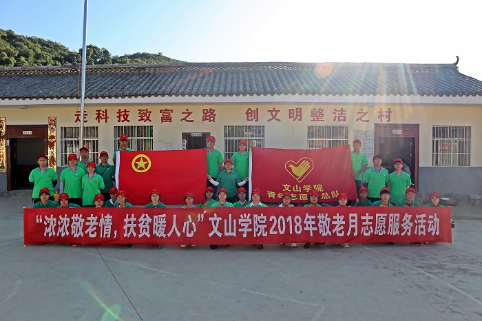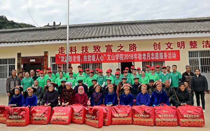 为进一步培育和践行社会主义核心价值观,发扬尊老、敬老、爱老、助老的中华传统美德,2018年10月31日,文山学院团委组织招募了以团学干部为主的30余名青年志愿者驱车前往砚山县者腊乡夸溪村委会八播村小组,开展了以“深深敬老情,扶贫暖人心”为主题2018年“敬老月”的志愿服务活动。