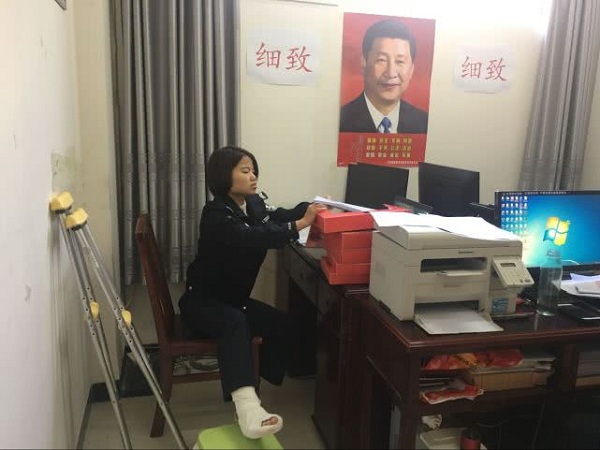 11月15日下班回家途中,向洪丹骑摩托不慎滑倒摔伤,导致右脚骨折。经过诊疗后,医生叮嘱她至少要在床上躺半个月,在家休息一个月后复查,伤口愈合后才能取石膏。听到医生的叮嘱后向洪丹的第一反应就是:“这么长时间啊,单位最近太忙了,我还有那么多工作要做啊!”回家后,脚上打上石膏的她仅仅在周末休息了2天,便在周一拄着拐杖,带伤来到了工作岗位。虽然右腿打着石膏,活动不便,但觉得自己还可以坚持,忍着疼痛把脚放在小凳子上,认真而有序地收阅文件、报送材料、查阅账目…… ,忙碌中她似乎也渐渐忘记了自己的腿伤,青紫肿胀浑然不知……