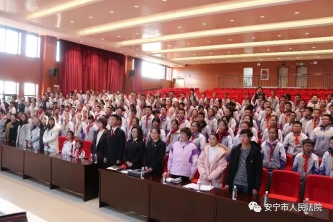 共青团安宁市委副书记邵鹏、安宁中学副校长张克忠参加了安宁中学模拟法庭活动,安宁中学初二年级600余名师生旁听了模拟法庭庭审。