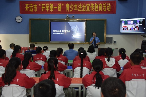图为2018年9月开远市开展开学第一讲——《宪法》宣讲进校园活动