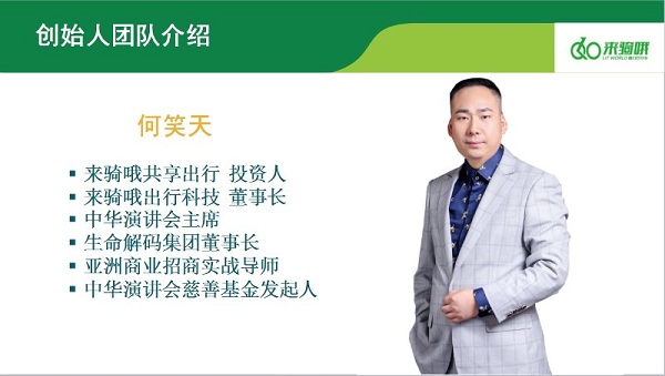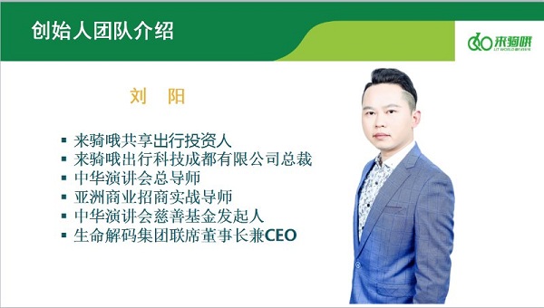 来骑哦出行科技有限公司的愿景与规划:成为全球最大共享资源运营商!欢迎各界社会人士,企业精英参加,共同开创美好的事业!为国家绿色出行做出更多更大的贡献!欢迎各大企业赞助商家,大家资源共享,合作共赢!