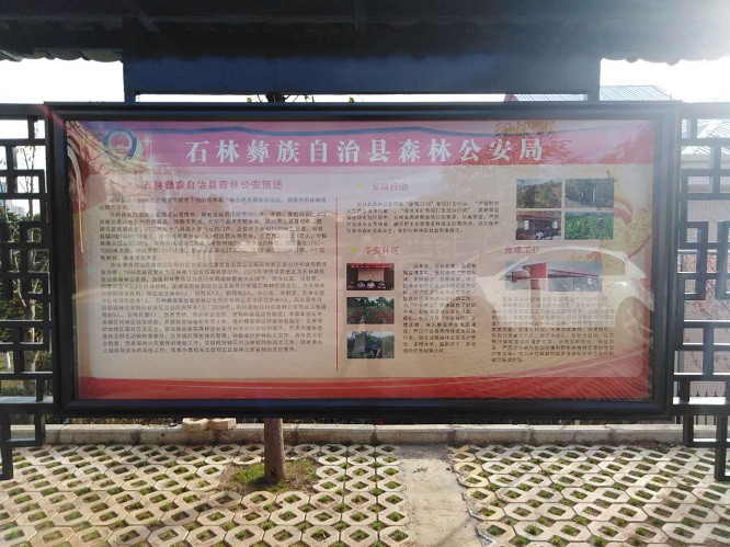 警营文化墙主要展示了石林县森林公安局建设、森林防火、脱贫攻坚、党建工作、队伍风采、保护动植物等主题。形象、直观、立体的展现了森林公安民警在队伍建设、规范执法、为民服务等工作生活领域中良好的精神风貌。提高了民警、辅警学习的热情和工作的激情。