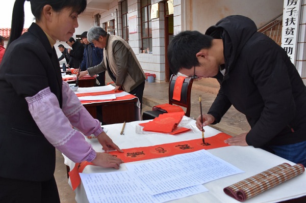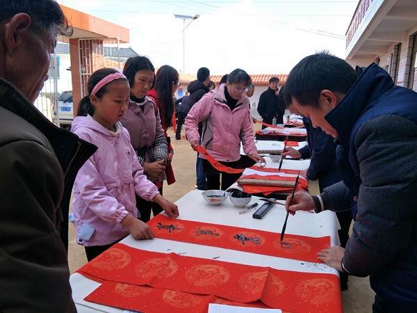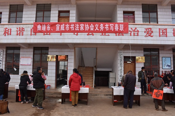 来自曲靖、宣威两地的书法家们现场挥毫泼墨,笔走龙蛇,书写字体或清新飘逸,或苍劲有力,但无一不是行云流水,风采尽显,力求用最好的作品把最好的祝福送给村民。现场气氛热烈,吸引了众多群众前来欣赏书法、索取春联。在马街村,由于当天正值赶集日,书写春联的场面异常热闹,当地百姓捧着散发墨香的春联、福字,脸上洋溢着喜悦的笑容。“和顺门第增百福 合家欢乐纳千祥”、“戌年引导小康路 亥岁迎来锦绣春”——各式各样的喜联鱼贯而出,未等晾干的春联墨宝迅速被热情的群众“一抢而空”。大家拿着这样的礼物,高兴之情溢于言表,纷纷表示谢意,并对书法家们的作品赞不绝口、如获至宝。