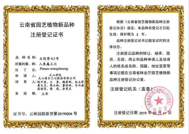 文山学院文山三七研究院的陈中坚研究员、王勇副研究员带领的三七育种团队与文山苗乡三七股份有限公司、中国中医科学院中药研究所合作,通过15年5代纯化选择,选育出高皂苷含量三七新品种“文院紫七1号”,于2019年2月11日获得品种登记证书(品种登记号:云林园植新登第20190004号),成为三七历史上首个高皂苷含量三七新品种,填补了该领域的空白。