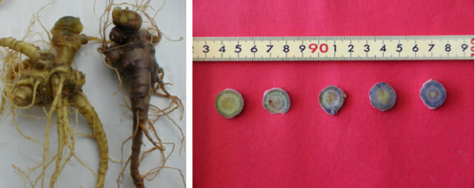 “文院紫七1号”在外观上与普通三七的区别是紫色块根及紫色断面菊花心,文山学院文山三七研究院早在2000年的研究已经认识到紫根三七的特性,发表了《三七植株的性状差异及其对三七产量和质量影响的调查研究》(中草药,2001-04),是最早报道紫根三七的论文。后续与云南农大合作研究发现了紫根三七的紫色素属于黄酮类化合物花色苷,紫三七有储存花色苷的能力,并且多次研究证实了紫根三七具有总皂苷含量高的特性。