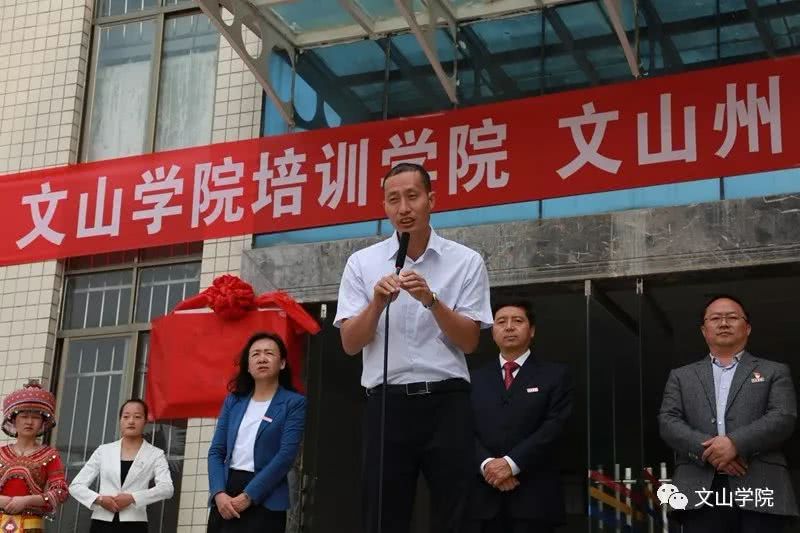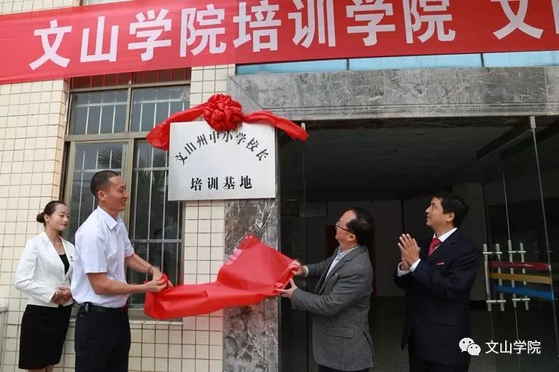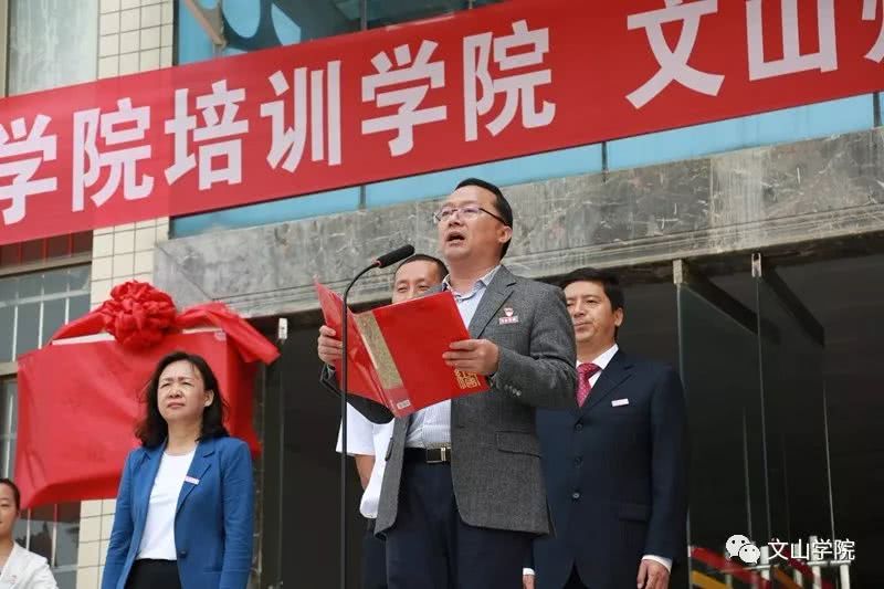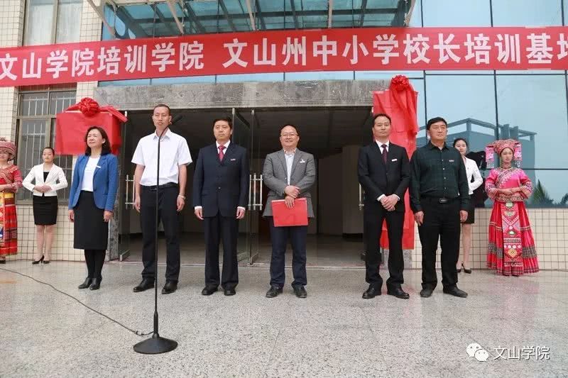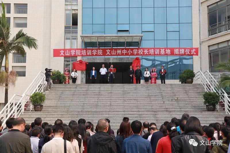 为更好地发挥文山学院在文山地区的社会培训作用,进一步加强学校服务地方经济社会的能力,有计划地对社会培训中有关的人力和资源进行合理配置,促进全州教育事业持续、健康发展,推进学校应用型示范校建设,2019年3月31日,“文山学院培训学院”、“文山州中小学校长培训基地”在文山学院成立,文山州教工委书记、州教育体育局党组书记、局长袁加全,文山学院党委书记熊荣元,党委副书记、院长李炳泽,党委副书记冯林虎,副院长吕昌会,纪委书记杨萍,组织部长李洪潮出席了揭牌仪式,仪式由冯林虎副书记主持。