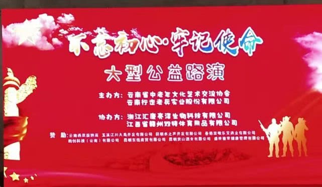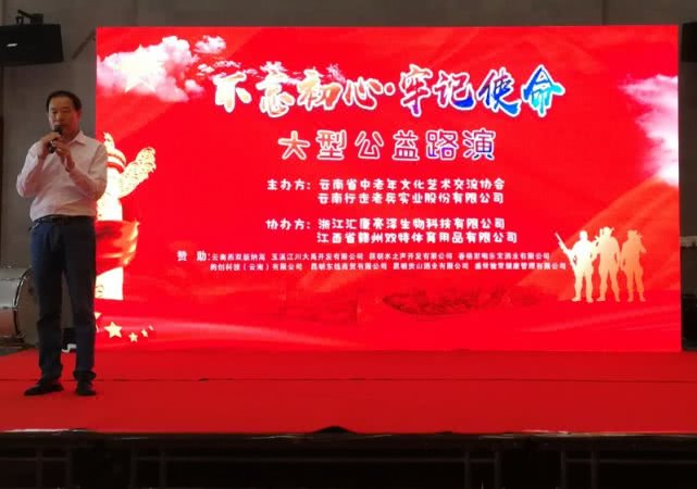 (柴霞文/图)近日、在建党98周年前夕、新中国成立70周年之际、由主办方:云南省中老年文化艺术交流协会、云南行走老兵实业股份有限公司及协办方:浙江汇康亮泽生物科技有限公司、江西省赣州双特体育用品有限公司、及云南省昆明市八家赞助商联合组织"不忘初心、牢记使命"、大型公益路演一一一在美丽的滇池湖伴昆明海埂公园艾维粤汐楼宴会厅隆重举行!