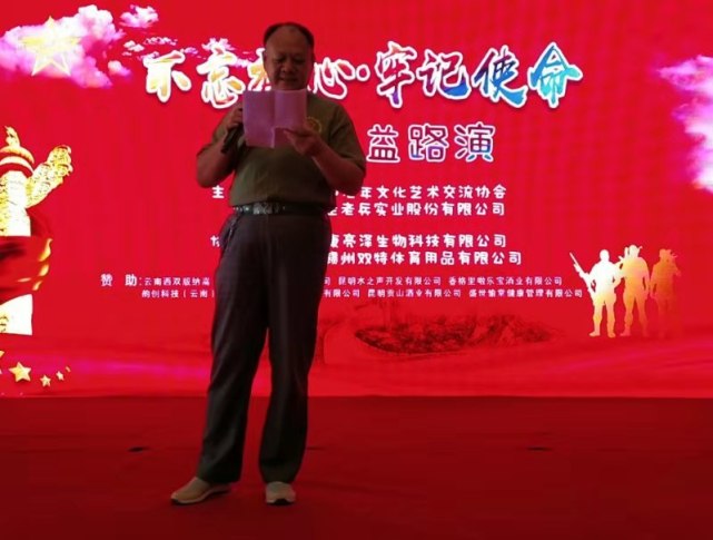 战斗英雄中央军委授予一等功臣、云南省劳模王国辉老领导台上发言、行走老兵创始人李青女士上台分享。 云南省中老年文化艺术交流协会主办方吴世全会长热情感慨讲话;传奇人物、影视博物馆刘辉馆长讲话及行走老兵爱心顾问姚祖国分享。
