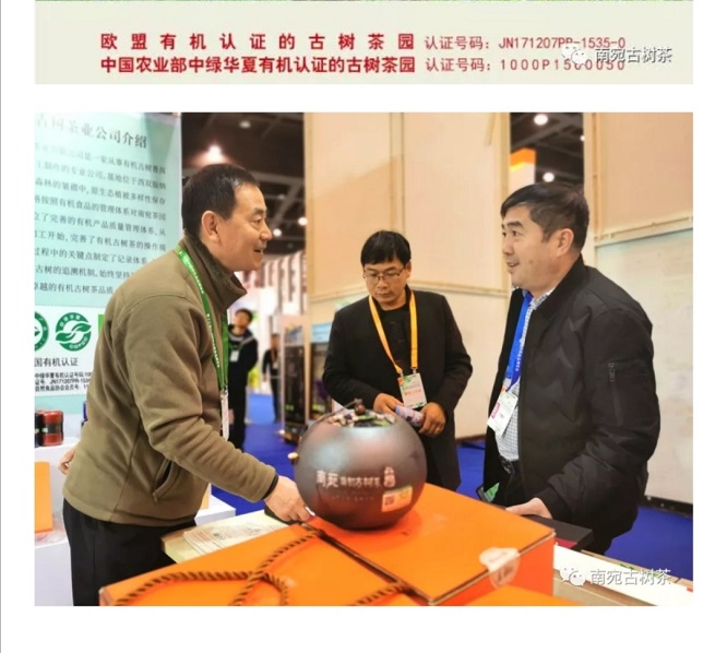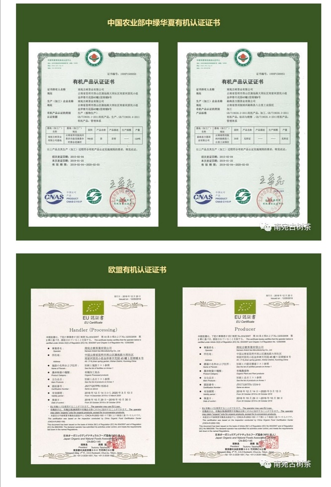 据了解,南宛古树茶业有限公司是一家从事古树普洱茶自有纯料加制作的专业公司。于2015年2月5日获得了中国农业部中绿华夏认证中心颁发的巜有机产品认证证书》,当人们品到南宛有机古树茶,彰显中国人气质与民族精神,2017年12月26日通过欧盟有机认证获得巜有机食品认证证书》,并获得巜日本有机和自然食品协会》会员资格。