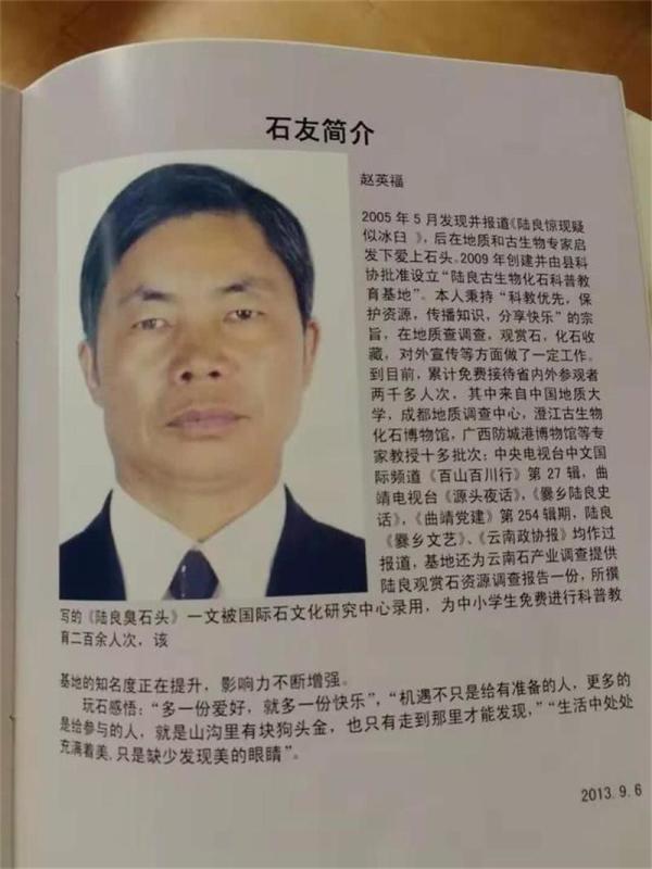 并成立了陆良观赏石协会,赵英福任会长,从此收藏、观赏、交流更多了,还成为了陆良县古生物化石科普教育基地,创办人赵英福先生醉心于化石、奇石的收藏、研究几十年,收藏了大量的古代海洋生物化石奇石。而且赵英福先生还是陆良疑似冰臼发现第一人,当年正是在赵先生的奔走呼吁下,陆良疑似冰臼才引起了各方面的重视,栽下梧桐树,引得凤凰来,