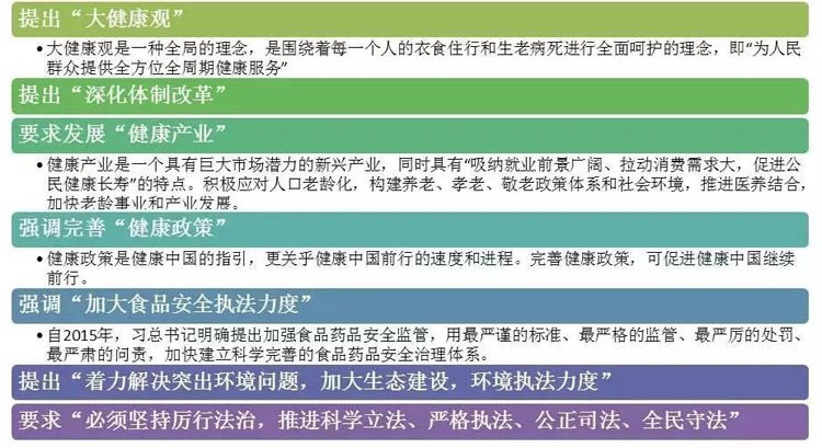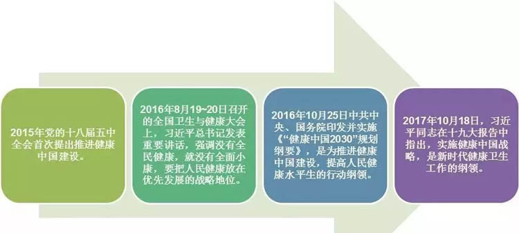 在短短的两年当中,国家密集地出台了关于健康产业的多项政策,多次强调健康产业的重要性,为我国发展健康产业打下了坚实的基础。如果说,2016年为健康中国战略元年,那么2017年已成健康中国建设元年。规划纲要为未来十余年的健康中国发展建设指明了方向及目标。