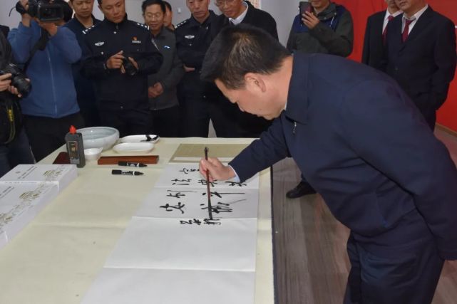 曲靖市委常委、市委政法委书记吴朝武出席开幕式、讲话并宣布开展。市委政法委常务副书记张兴聪主持开幕式。云南省书法家协会副主席、曲靖市书法家协会主席朱从凯介绍活动情况。市委政法委、市中级人民法院、市人民检察院、市公安局、市国家安全局、市司法局、市文化和旅游局、省第四监狱、省中安监狱、省曲靖监狱有关领导和政法干警和市书法家协会书法家共计280余人参加了开幕式和展览活动。