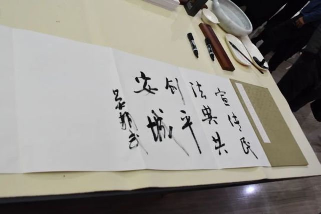 曲靖市书法家协会主席朱从凯热情邀请曲靖市委常委、市委政法委书记吴朝武留下墨宝。吴朝武现场挥豪写下“宣传民法典 共创平安城”。