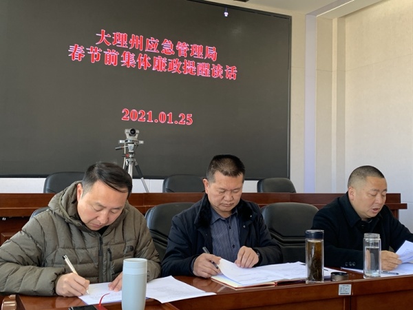 1月25日,大理州应急管理局召开春节前集体廉政谈话会议,就清廉过节进行安排部署,局党委书记、局长何建雄同志与班子成员、科室负责人进行集体廉政谈话。