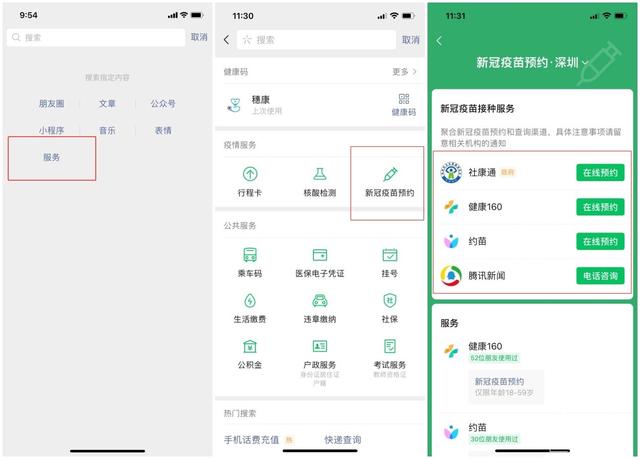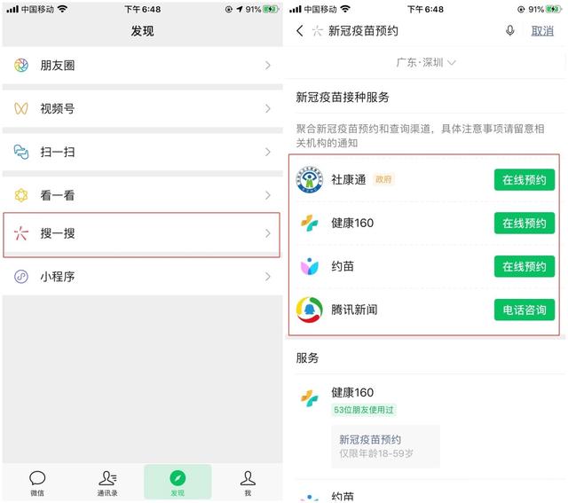 用户点击微信首页上方的搜索框,点击“服务”,选择“疫情服务”模块的“新冠疫苗预约”或在搜索框输入“新冠疫苗预约”,即可进入新冠疫苗预约服务页面。除服务导航页外,用户也能通过微信发现页搜一搜,搜索“新冠疫苗预约”进入新冠疫苗接种预约服务页面。